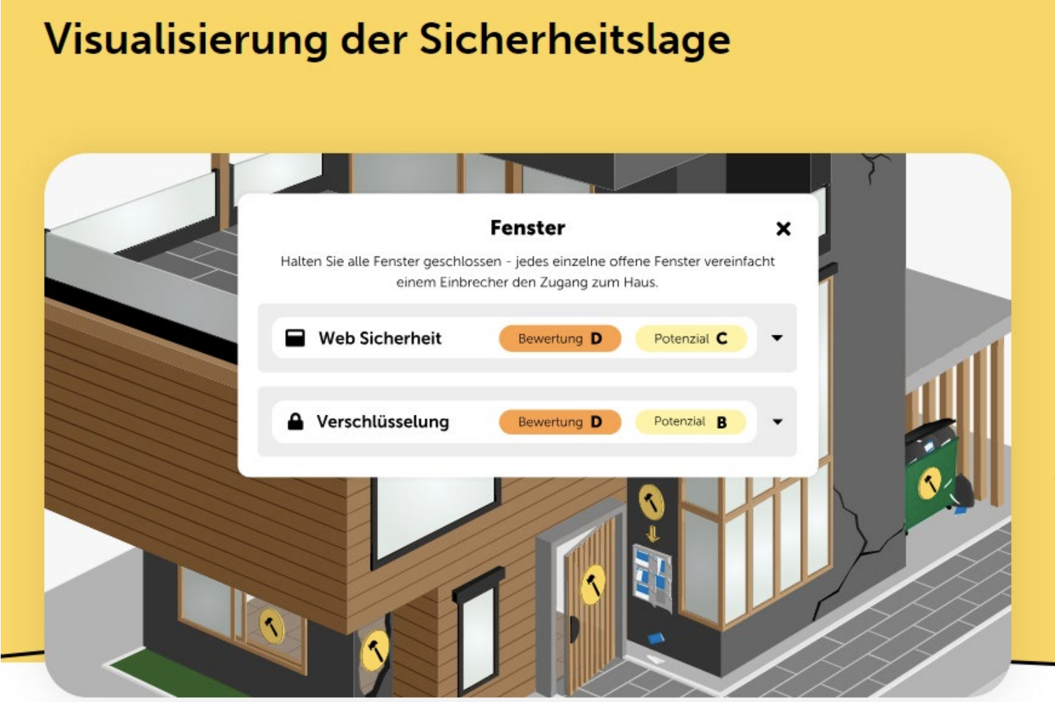 Ihre aktuelle Sicherheitslage wird bildlich durch ein Haus dargestellt. Fehlende Türen und offene Fenster symbolisieren die Angriffspunkte Ihrer Infrastruktur